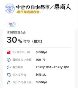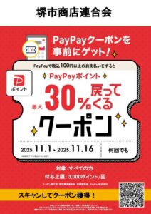 11/1~【堺市商店連合会】ペイペイ30%戻ってくるクーポン配信中!
