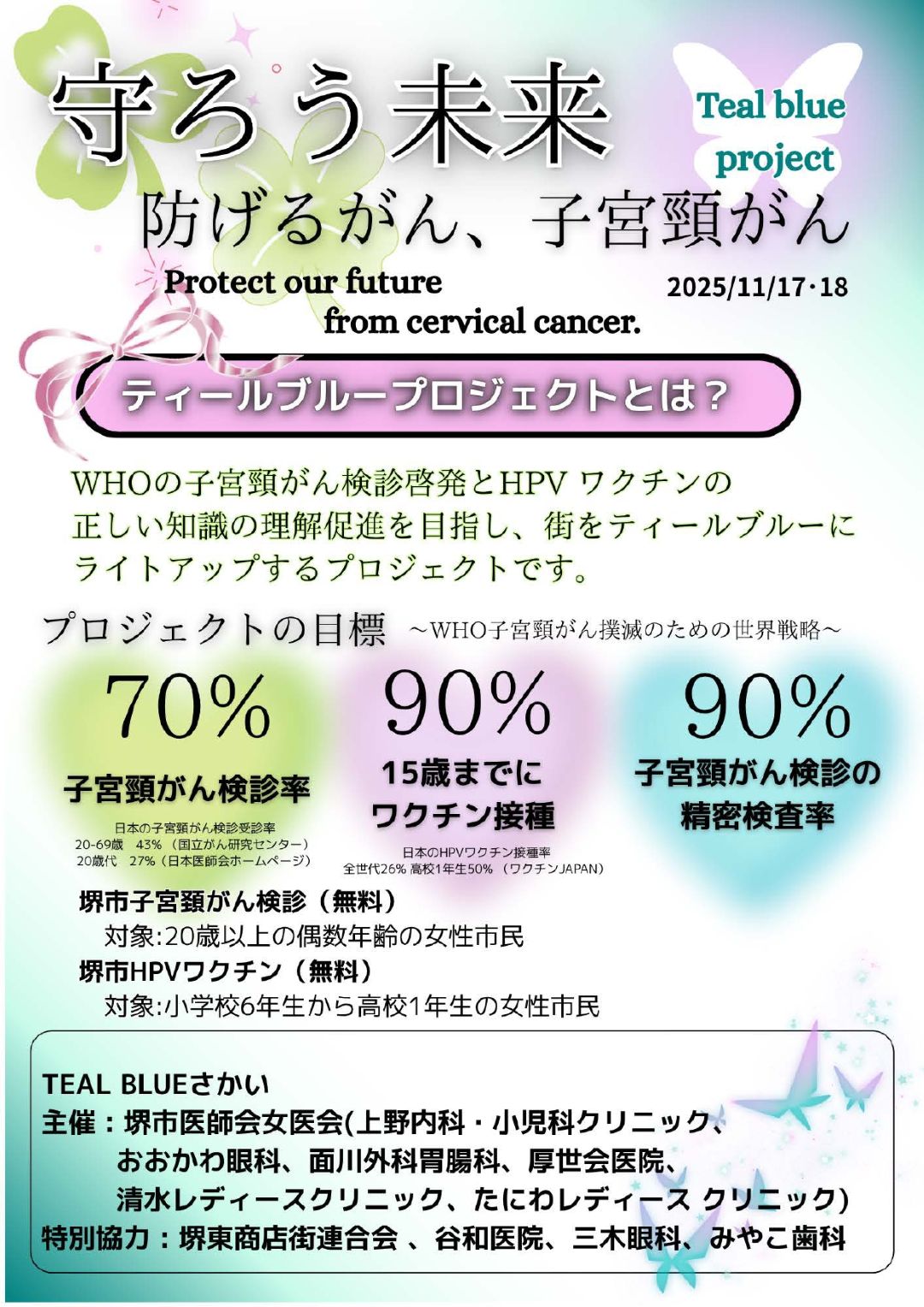 堺市では、子宮頸がんの正しい知識と検診・HPVワクチン接種の大切さを広く知っていただくため、街をティールブルーの光で彩る「ティールブループロジェクト」を実施します。