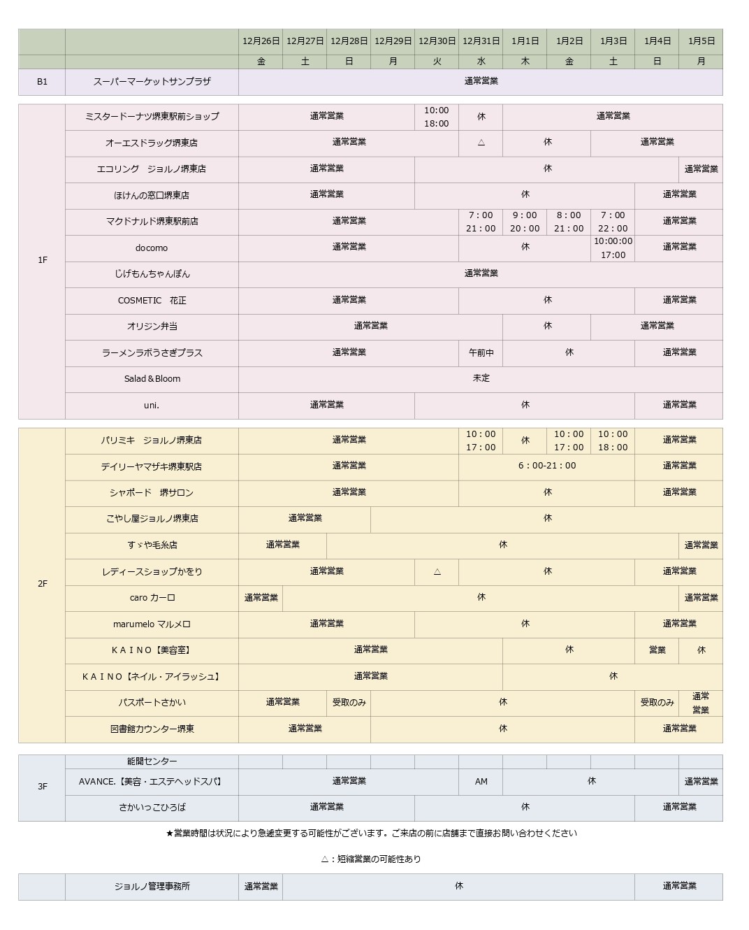いつも当館をご利用いただき、誠にありがとうございます。年末年始期間中の各店舗の営業日・営業時間は、下記一覧の通りとなります。店舗により休業日や営業時間が異なりますので、ご来館の際は事前にご確認ください。